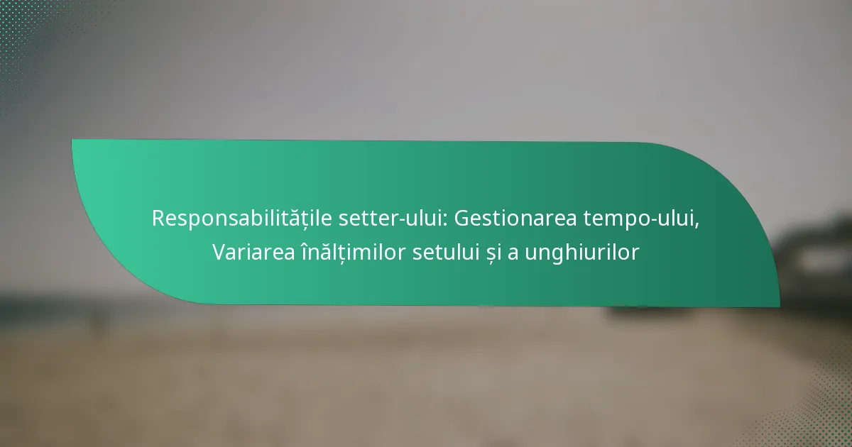 Variațiile unghiurilor în setare se referă la diferitele traiectorii pe care un setter le poate folosi pentru a livra mingea către atacanți. Aceste variații pot include unghiuri înalte, joase și laterale, fiecare influențând modul în care mingea se apropie de fileu și timingul pentru atacant. Înțelegerea acestor unghiuri permite setterilor să creeze jocuri ofensive diverse.
